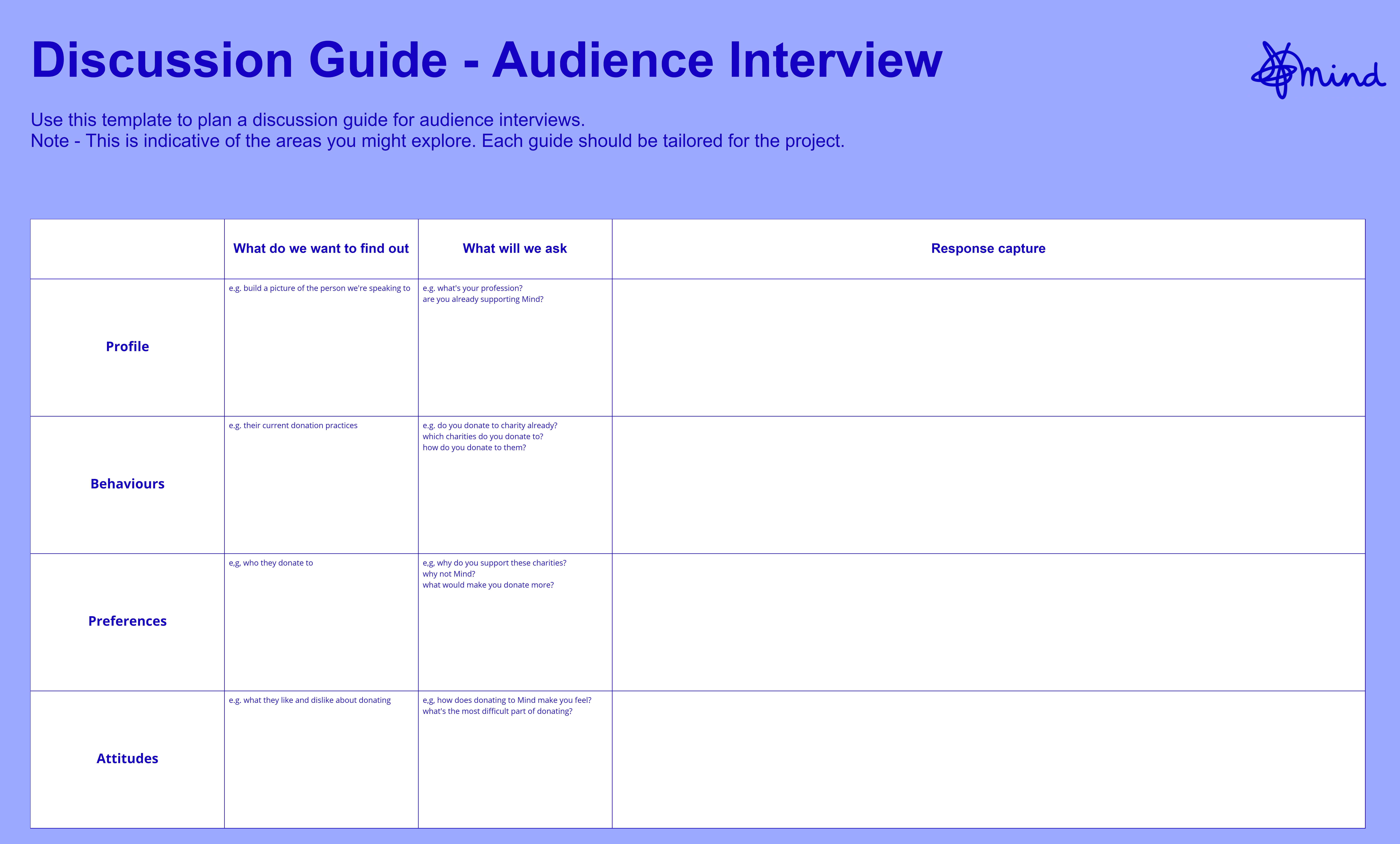 A way to think through, structure and prepare for interviews with your target audience. This may need to be tailored for your specific project.